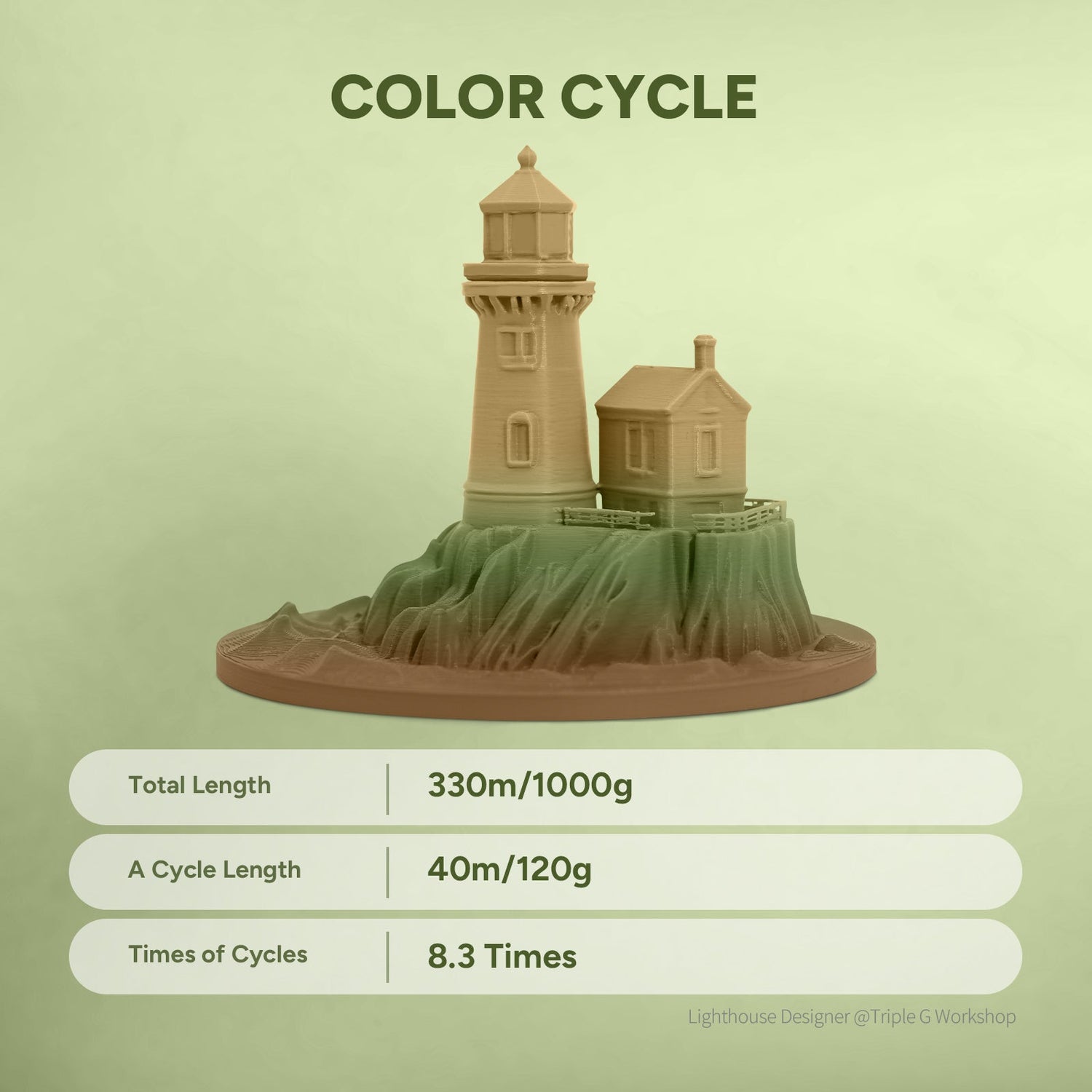 The total length of a color change cycle is approximately 60 meters. A 1 kg roll contains about 5.5 color change cycles, featuring four distinct colors: red, yellow, green, and blue. In one cycle, the lengths of each color are roughly as follows: red (12-15m), yellow (12-15m), green (12-15m), and blue (12-15m). For small print pieces, the gradient effect may not be very noticeable. To enhance the gradient effect, you can increase the material consumption in your slicer settings.