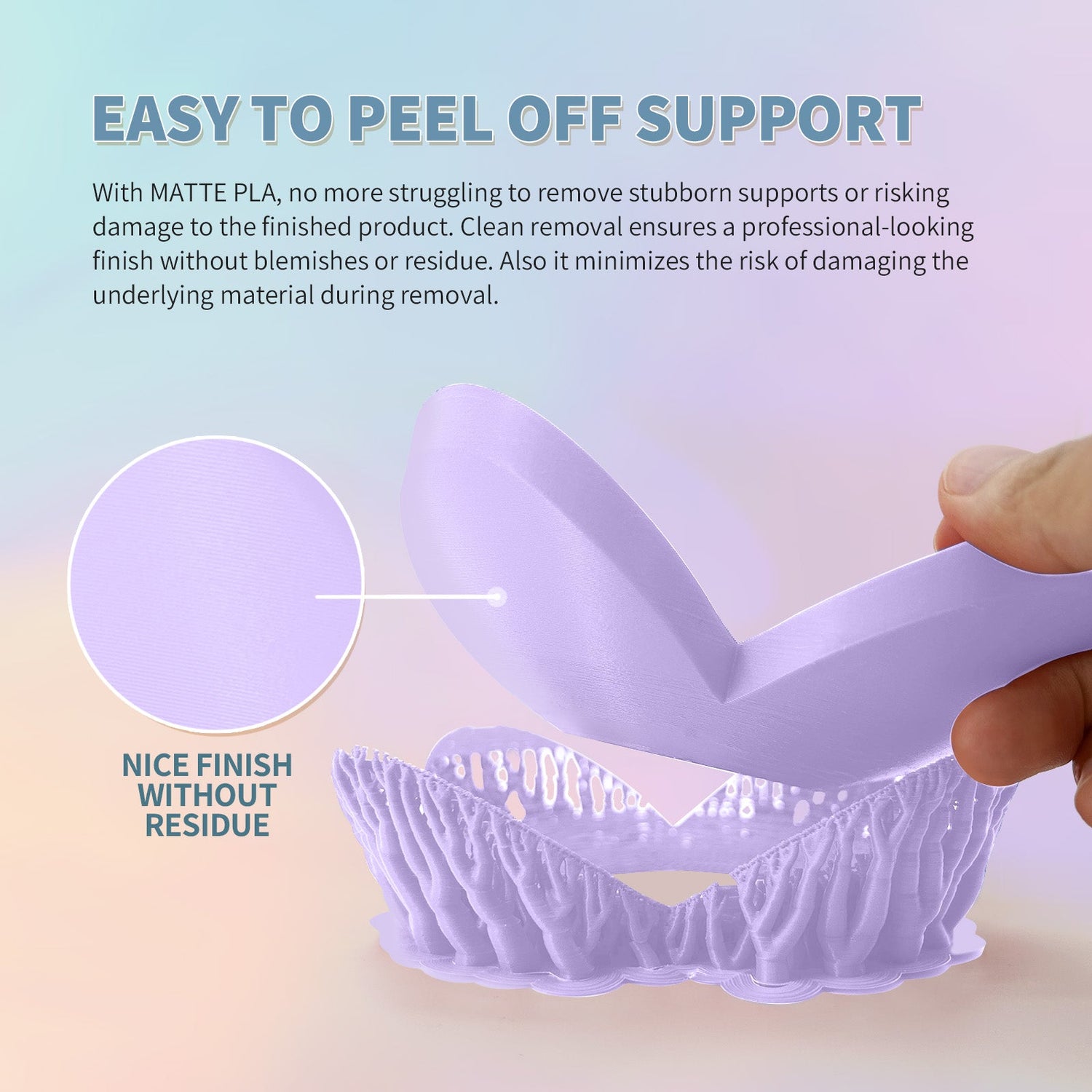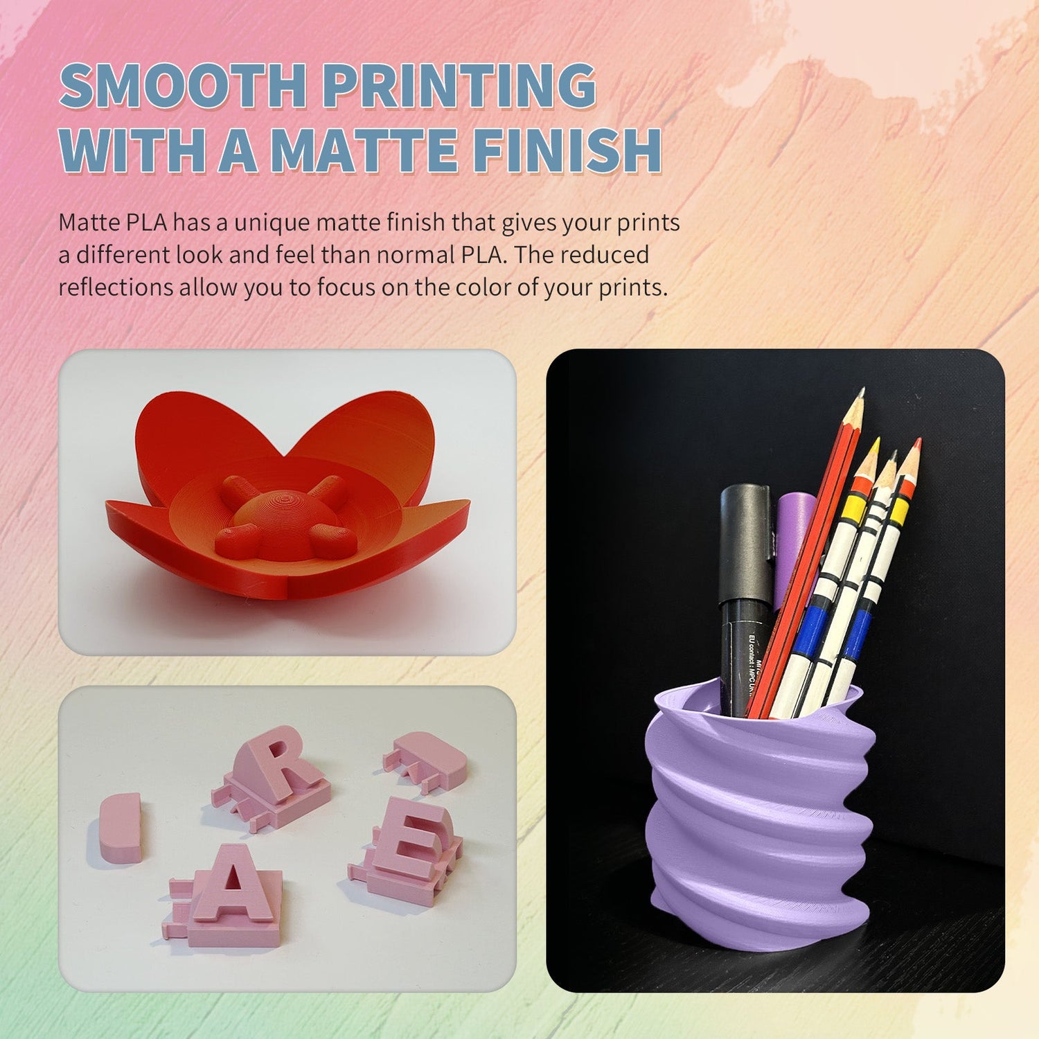 Matte surface PLA-based 3D printing filament is an excellent choice for customers at various stages of 3D printing journey. Compatible with all extrusion-based 3D printers, Matte PLA allows for easy removal of supports, making the printing process hassle-free.