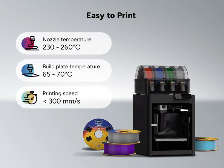 PETG-based filaments are sensitive to moisture, so we recommend drying them at 65°C (149°F) for 7 hours. Avoid prolonged drying times, as excessive heat can cause the filament to become brittle and unsuitable for printing. For storage, keep it in a sealed container with desiccants to maintain low humidity levels.
