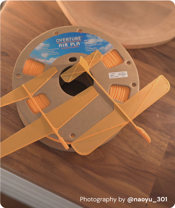 Overture AIR PLA is designed to be lightweight, with a density of 0.9 g/cm³, compared to the higher density of regular PLA at 1.16 g/cm³. This significant difference allows AIR PLA to achieve lighter prints without requiring extensive modifications to printing settings, making it easier to use while still delivering high-quality results.