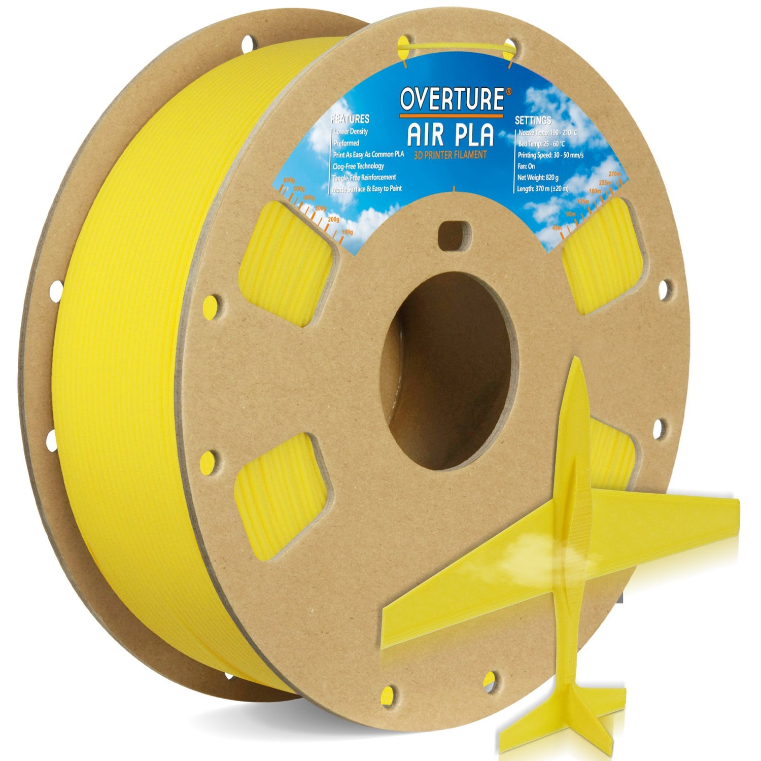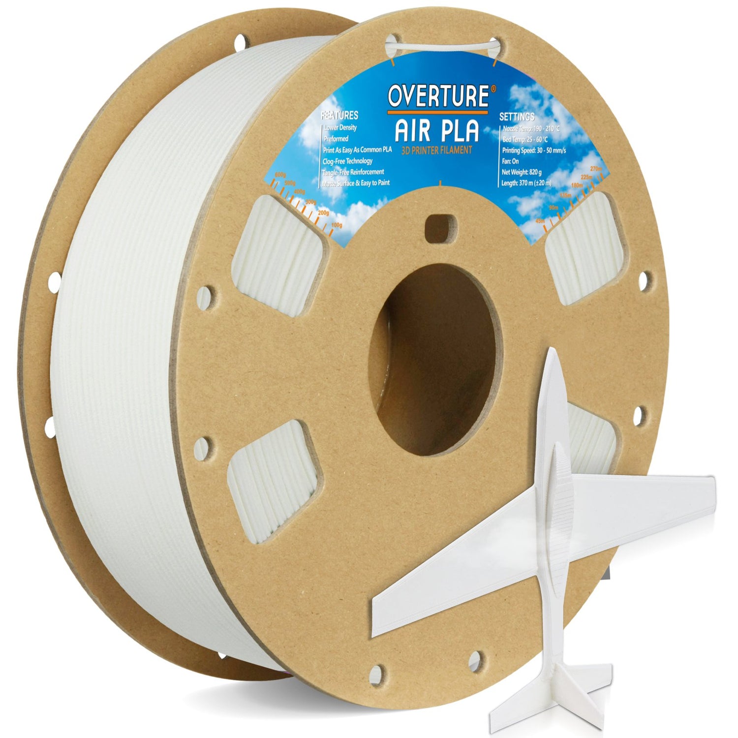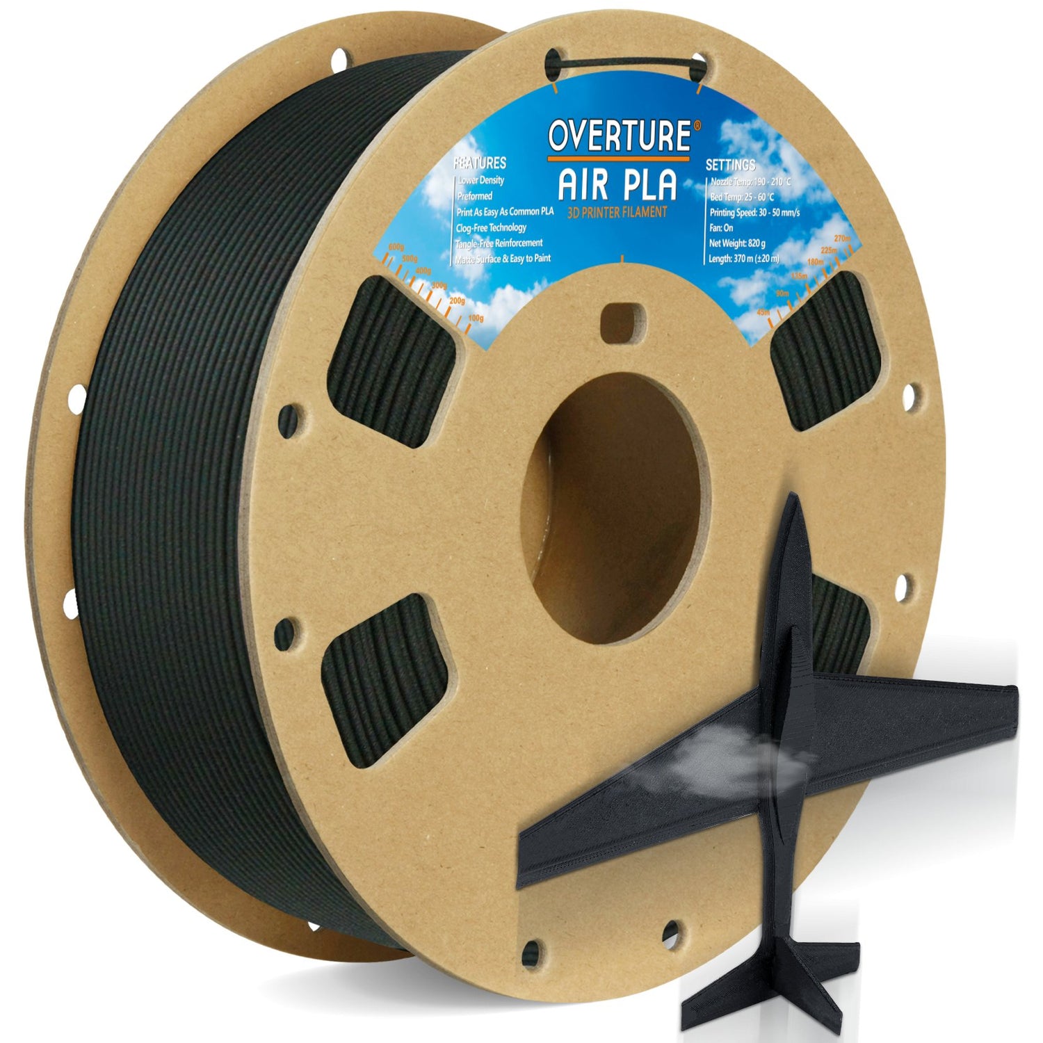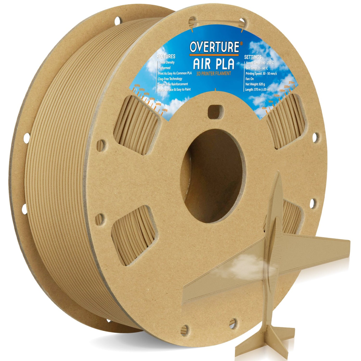 Overture AIR PLA, a remarkable low-density foam filament designed to revolutionize your 3D printing experience! Utilizing advanced foaming technology, AIR PLA achieves a density approximately 20% lighter than standard PLA, allowing for the creation of high-quality printed parts that are significantly easier to handle.